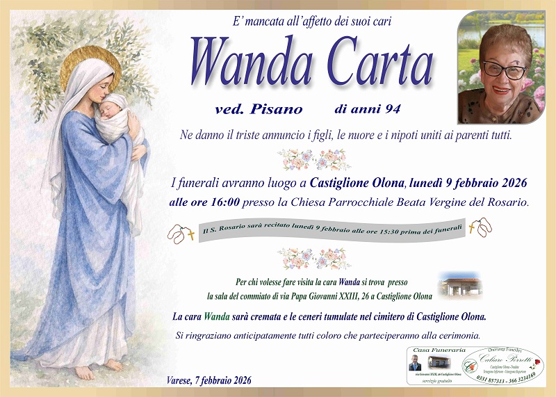 I funerali avranno luogo a Castiglione Olona, lunedì 9 febbraio 2026