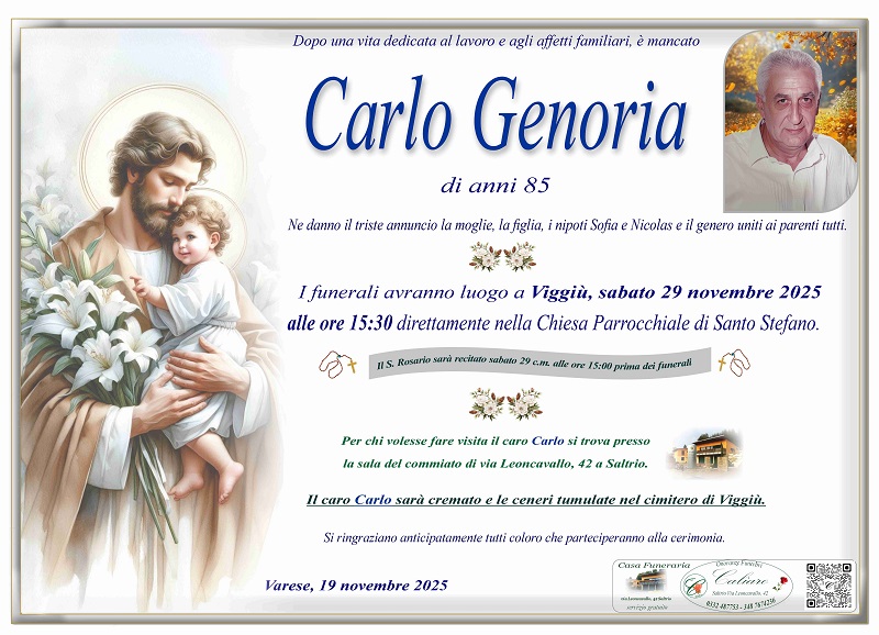 I funerali avranno luogo a Viggiù, sabato 29 novembre 2025